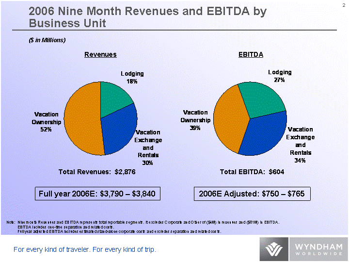 | 2006 Nine Month Revenues and EBITDA by Business Unit Lodging 0.27 0.27 Vacation Exchange and Rentals 0.34 0.34 Vacation Ownership 0.391 0.39 Lodging 0.18 Vacation Exchange and Rentals 0.3 Vacation Ownership 0.52 Revenues EBITDA Total Revenues: $2,876 Total EBITDA: $604 ($ in Millions) Note: Nine month Revenues and EBITDA represents total reportable segments. It excludes Corporate and Other of ($4M) in revenues and ($81M) in EBITDA. EBITDA includes one-time separation and related costs. Full year adjusted EBITDA includes estimated stand-alone corporate costs and excludes separation and related costs. Full year 2006E: $3,790 - $3,840 2006E Adjusted: $750 - $765 2 |