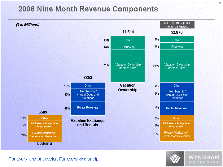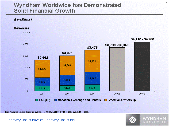 | 2006 Nine Month Revenue Components ($ in Millions) Lodging $509 Vacation Exchange and Rentals $853 Vacation Ownership Other Financing Vacation Ownership Interest Sales $1,514 Membership/ Transaction Revenue Other Financing Vacation Ownership Interest Sales $2,876 Other Membership/ Annual Dues and Exchange Rental Revenues Membership/ Transaction Revenue Other Rental Revenues Membership/ Annual Dues and Exchange 42% 12% 46% 15% 14% 71% 7% 7% 38% 4% 12% 14% Q4E: $ 918 - $968 Total Company Royalty/Marketing/ Reservation Revenues TripRewards & Wyndham Reimbursables Other 11% 17% 72% 2% 3% 13% Royalty/Marketing/ Reservation Revenues TripRewards & Wyndham Reimbursables Other 5 |